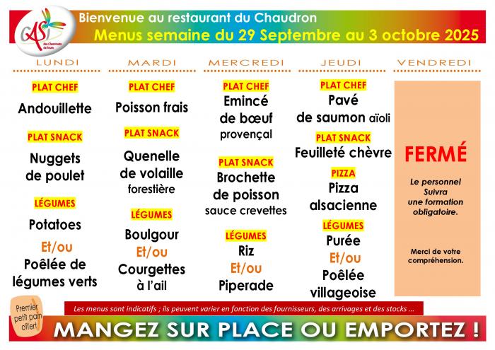 Les menus sont indicatifs; ils peuvent varier en fonction des fournisseurs, des arrivages et des stocks.